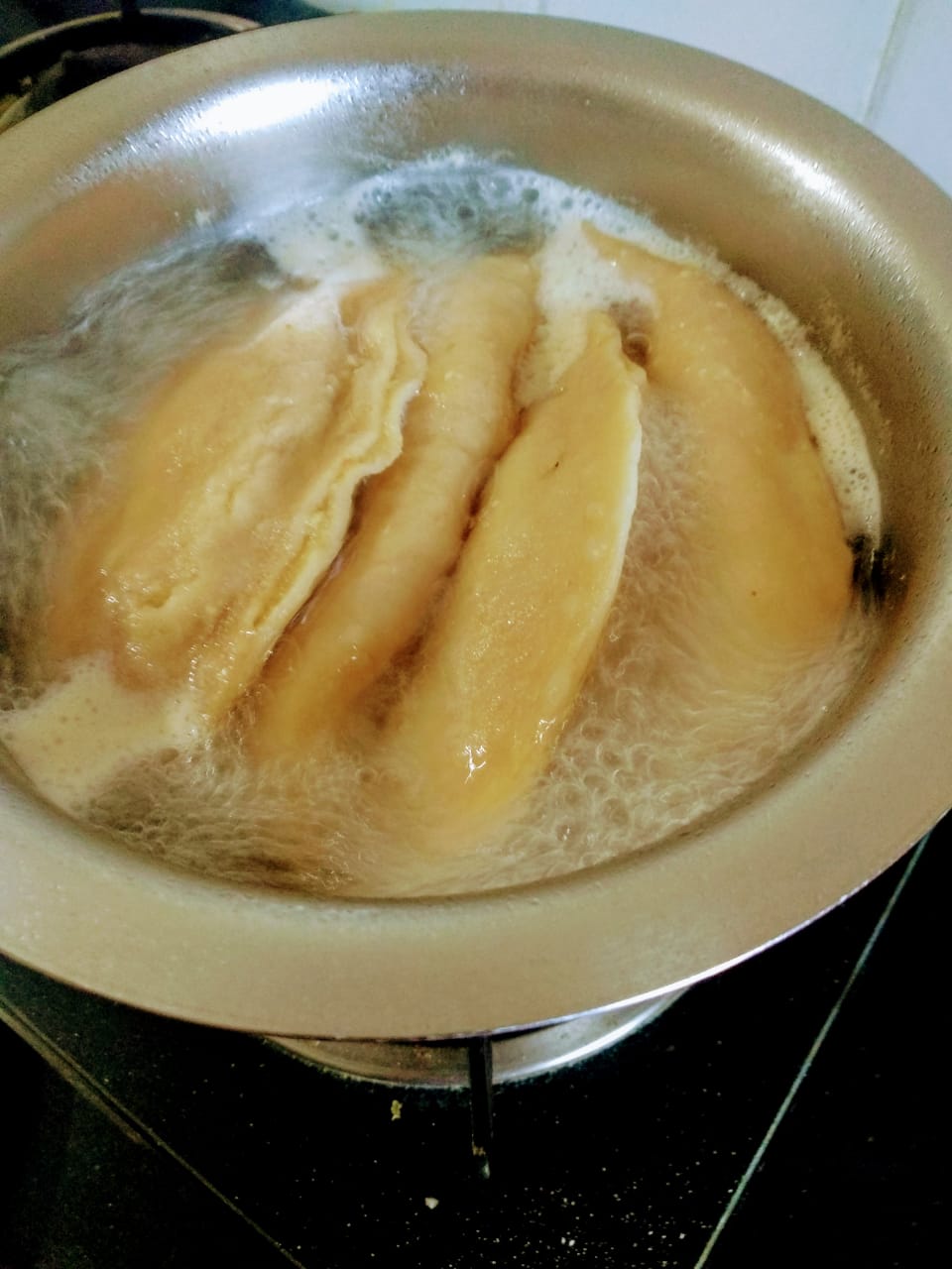 Once it comes above water take out in strainer and cut in thin slices. Shallow fry with a pinch of Ajwain (Caroom seeds) till it turns golden and crispy.