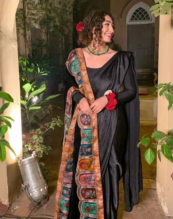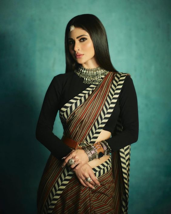 This different saree winter wear creates a striking fashion trend by fitting the classic beauty of a saree with leather for a unique and elegant look. All sarees will look great with a black or brown jacket. A saree can be worn with a leather jacket and boots, and you look stunning in this attire.