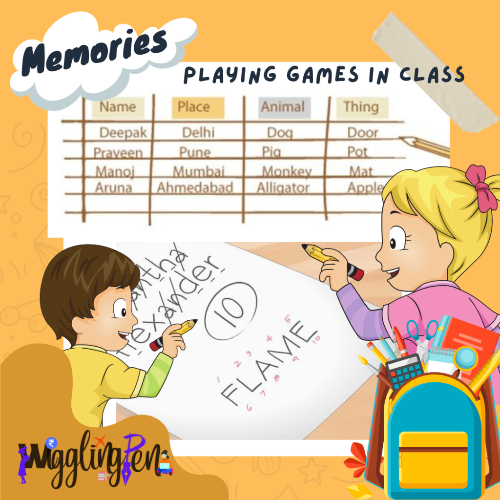 Another school life memories includes playing name, place, animal and thing or Flames in class sitting in last bench in some boring period. Last page of our copies were filled with that.