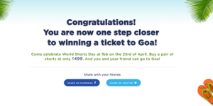 - Go to store on 23rd April 2017 and buy shorts and submit the mobile number to win a trip to Goa.